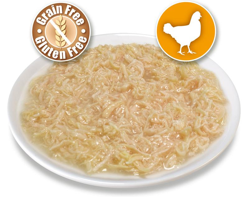 Cans of chicken in sauce. Tasty and nutritious complementary food that provides fluid to cats, very necessary for good kidney function.